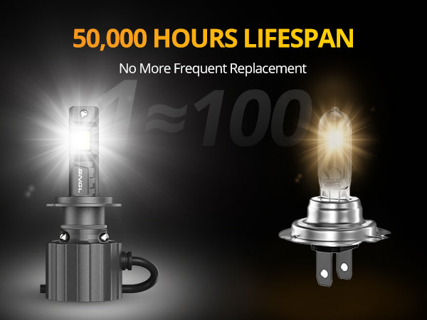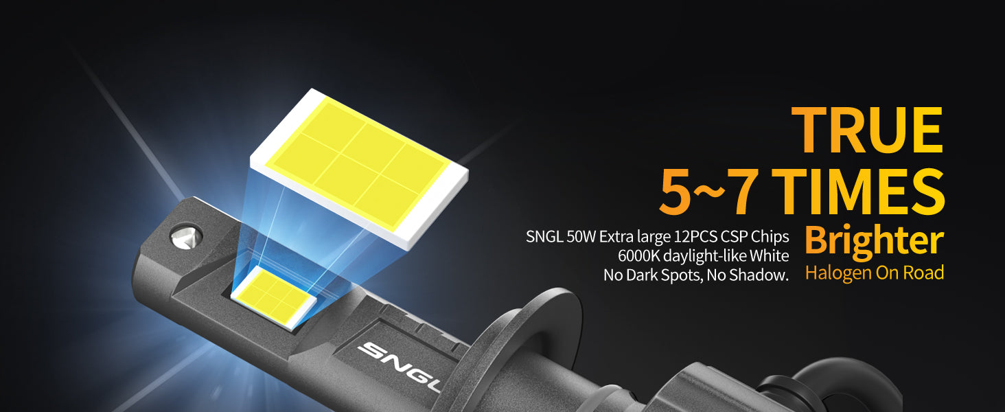 True 5~7 Times Brighter Halogen On Road: up to 34000LM 150W Per Set, 6000k xenon white; SNGL upgraded H7 LED Headlight Bulb which adopted 2PCS SNGL automotive grade 50W Extra large CSP Chips each bulb produce a brightest white daylight-like focused Beam, See wider and farther in the night, rainy, fogy, snowy days driving.