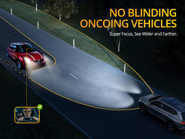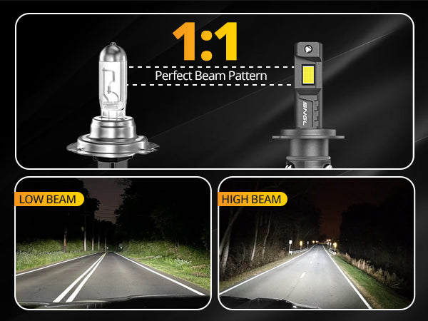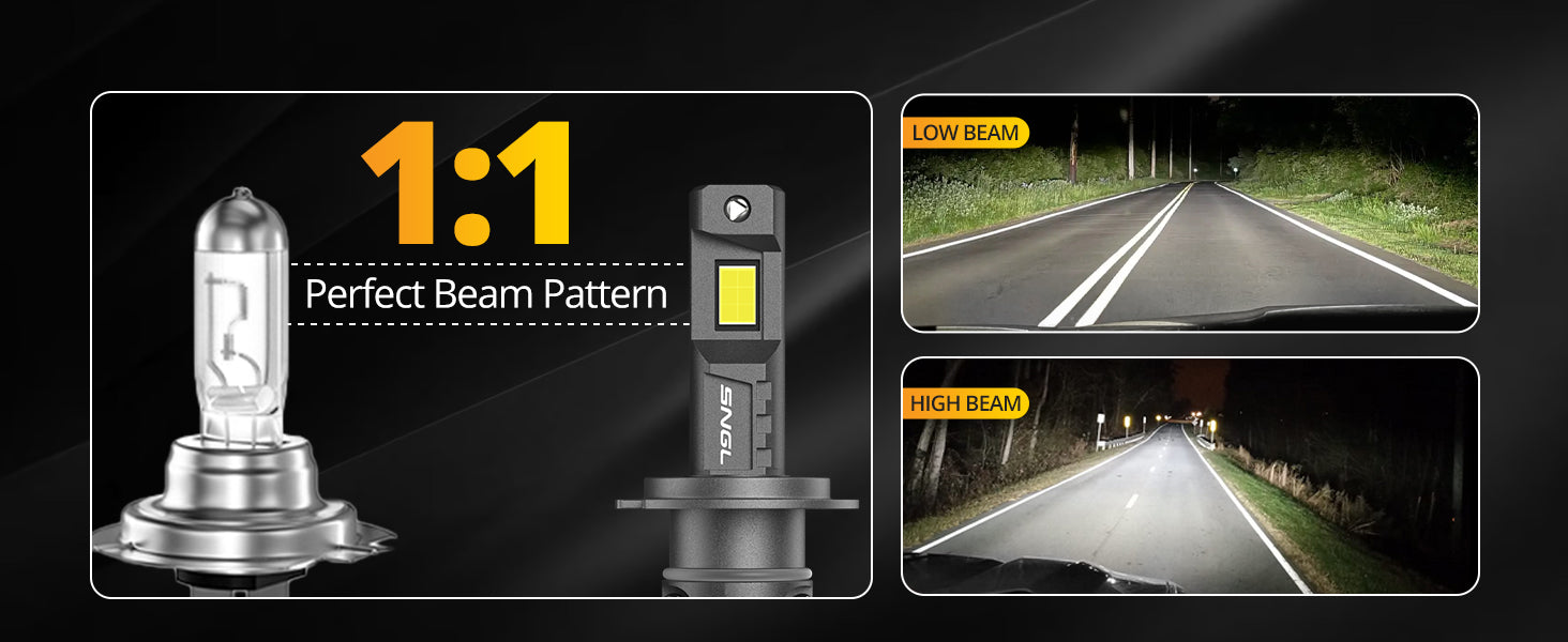 Ultra Bright Safe Beam Pattern: SNGL H7 led bulb perfectly replicated Halogen Filament Placement--and Increased central light intensity provides improved road visibility for distance and width, up to 850%; No glare light & dark area and will not blinding oncoming vehicles with clear cutoff line.