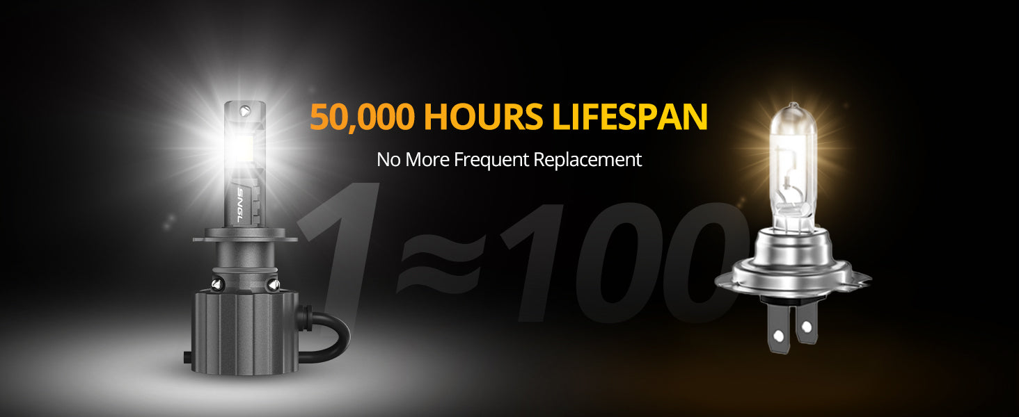 50,000Hr Life Span: SNGL H7 headlight bulbs built in a Powerful Cooling Management System and use the best components and high quality materials, ensuring more than 50,000 hours continuous lighting. IP67 Rain-Resistant Build, exclusive 75W LED drivers with over-heat & Fan Failure Protection ,and Fan works even in extreme situations. Does not require frequent replacement.