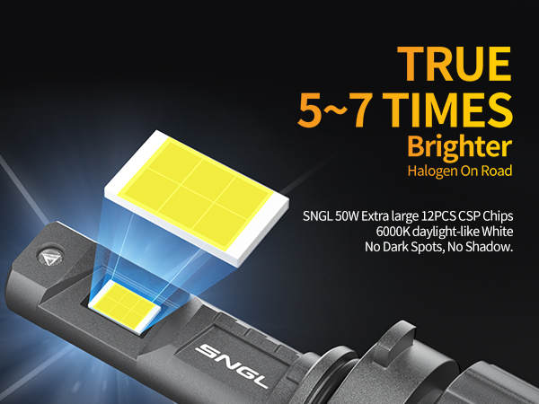 - True 5~7 Times Brighter Halogen On Road: up to 34000LM 150W Per Set, 6000k xenon white; SNGL upgraded HB3 9005 LED Headlight Bulb which adopted 2PCS SNGL automotive grade 50W Extra large CSP Chips each bulb produce a brightest white daylight-like focused Beam, See wider and farther in the night, rainy, fogy, snowy days driving.