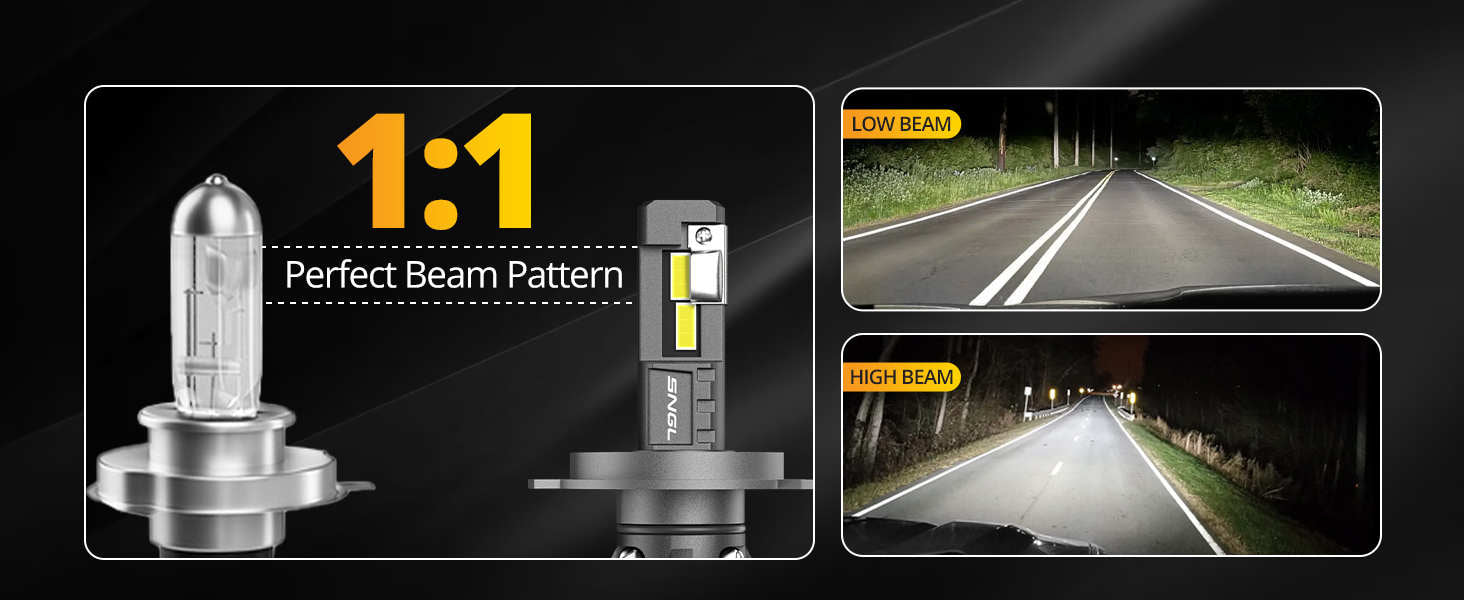- Ultra Bright Safe Beam Pattern: SNGL 9003 H4 led bulb perfectly replicated Halogen Filament Placement--and Increased central light intensity provides improved road visibility for distance and width, up to 850%; No glare light & dark area and will not blinding oncoming vehicles with clear cutoff line.