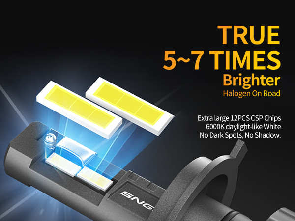 - True 5~7 Times Brighter Halogen On Road: up to 34000LM 150W Per Set, 6000k xenon white; SNGL upgraded 9003 H4 LED Headlight Bulb which adopted 4PCS SNGL automotive grade 35W Extra large CSP Chips each bulb produce a brightest white daylight-like focused Beam, See wider and farther in the night, rainy, fogy, snowy days driving.