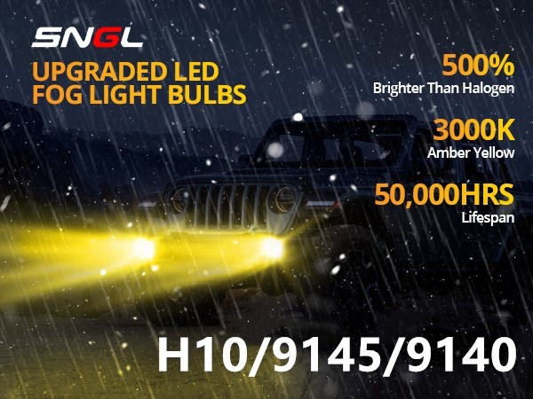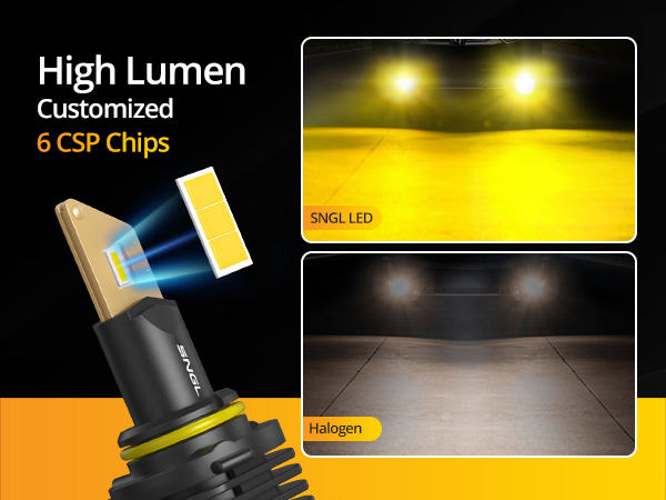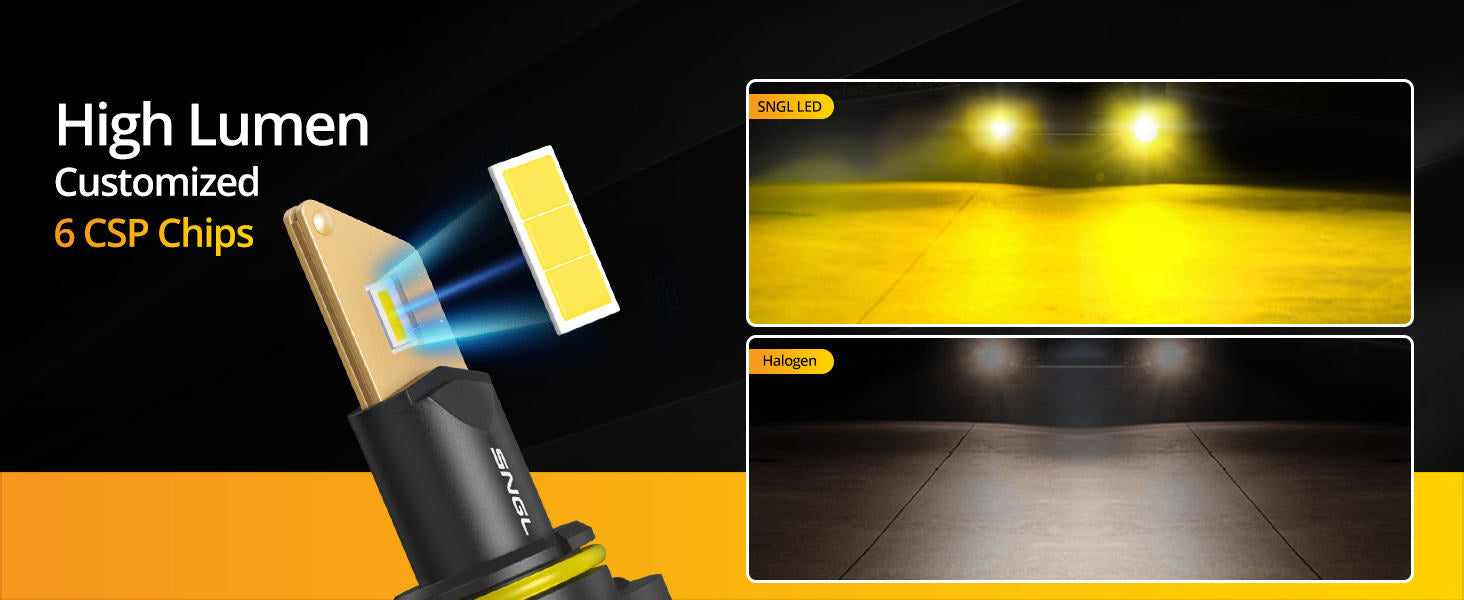 • 500% Brighter Than Halogen: each SNGL h10 yellow led fog light bulbs adopts high power 6CSP led chips, provides 13000LM/Set light output. 500% brighter than stock halogen fog lights; 3000K amber yellow light allows you to see farther and wider and driving safer on road.