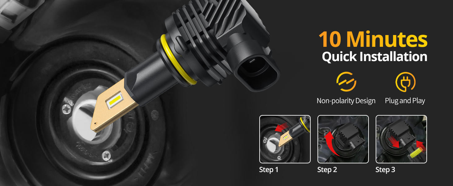 • 10 Mins Plug N Play Installation: SNGL h10 yellow fog light bulb is wireless & Fanless & non-polarity & plug and play designed. 1:1 mini size body, perfectly fit into your front fog light or DRL housing without any modification. replace for 9040/9045/9140/9145/PY20D/9155/H10 led fog lights or halogen bulbs.
