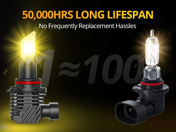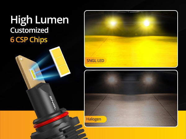 SNGL 9006 led fog light bulbs yellow are 50W, 13000LM per set, 500% brighter than halogen fog lights. The 1:1 beam pattern perfectly